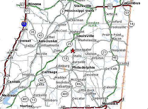 From Jackson, MS, take Highway 25 north to Carthage, take Highway 16 east to Philadelphia, and take Highway 15 north to Noxapater.